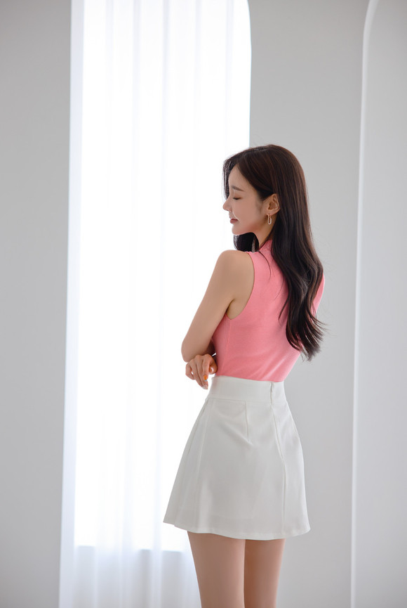 粉白搭配清爽明媚,无袖上衣勾勒纤细手臂,高腰短裙俏皮蝴蝶结,搭配高跟凉鞋拉长优雅线条,简约穿搭尽显活力少女感与妩媚魅力。